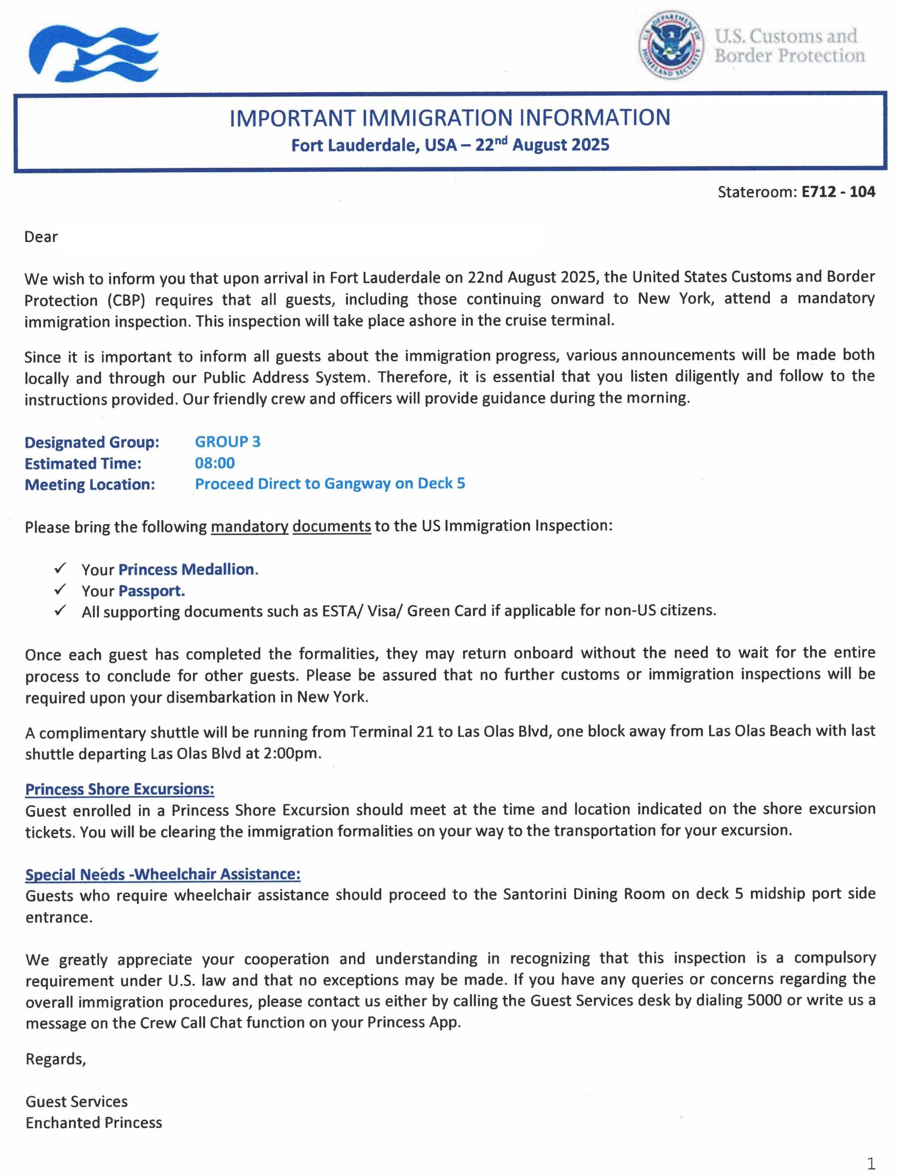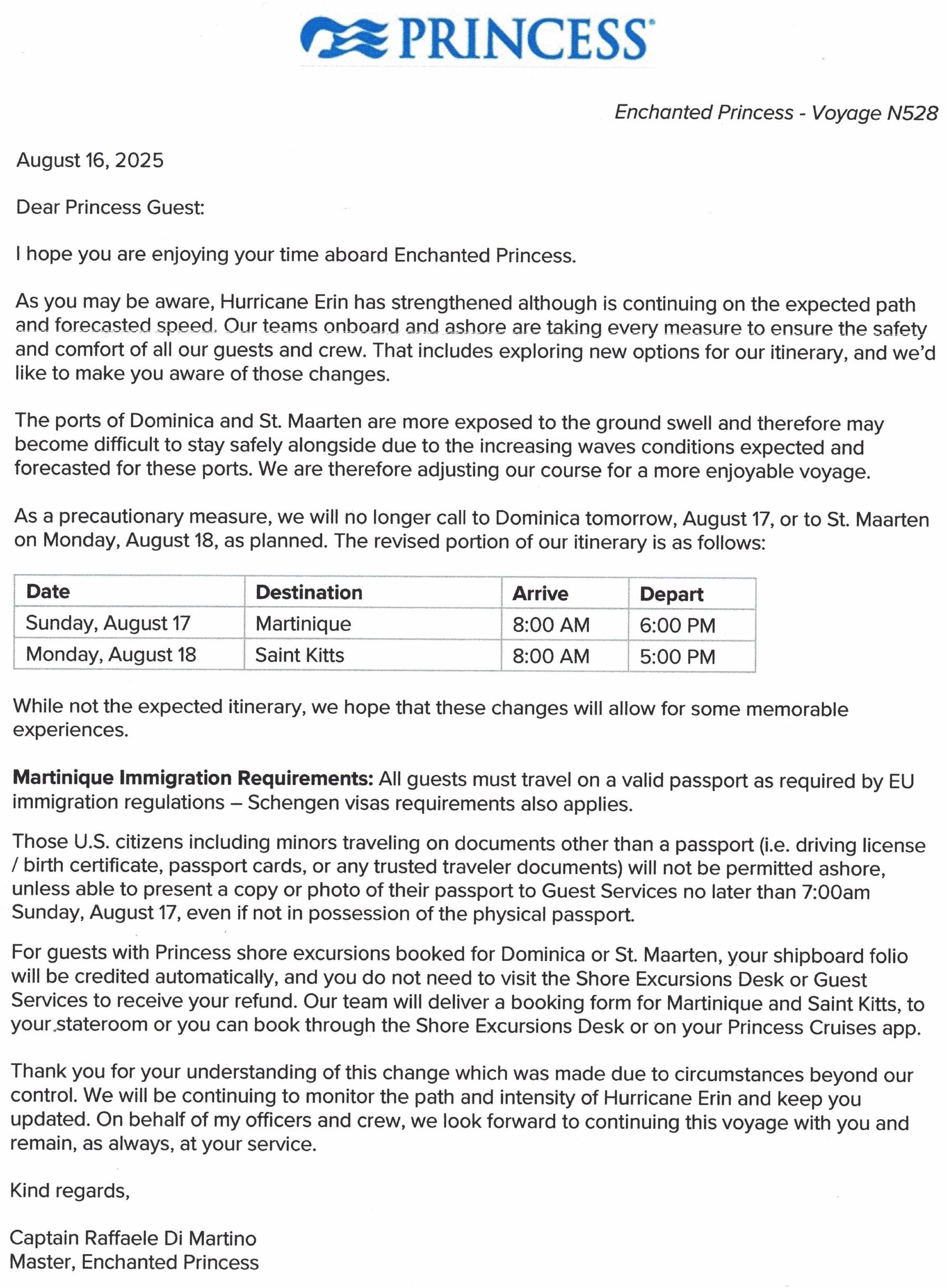 Information about the first itinerary change, where Dominica is replaced with Martinique and St. Maarten is replaced with St. Kitts.